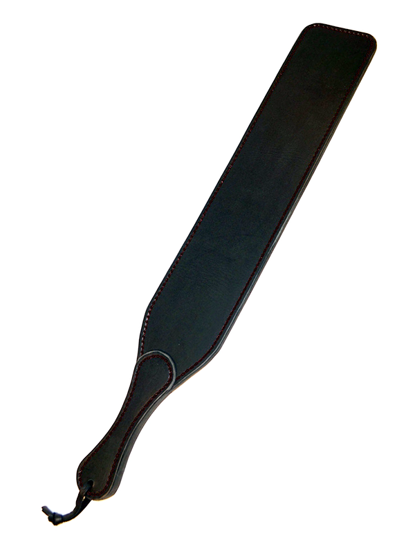 Bigger is badder! This 22" paddle is the largest the Canadian folks at 6Whips has on offer, and wow, is it ever substantial. Composed of two layers of medium/heavy grade English bridle leather is lovingly sewn together to create an amazing paddle that is approximately 1/4" thick. Two additional layers have been added to the handle, making it approximately 1/2" thick. Due to the length of this toy, it is semi-rigid, meaning it's got some good wobble. Great for all kinds of thwacky adventures!