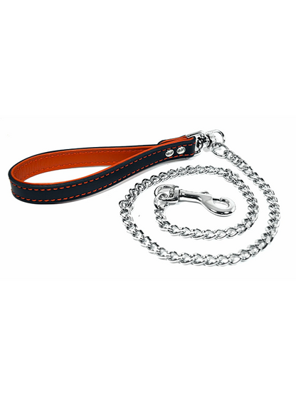 This handmade 3 foot chain leash features a swivel connector and a 3/4" wide leather handle with soft leather lining.