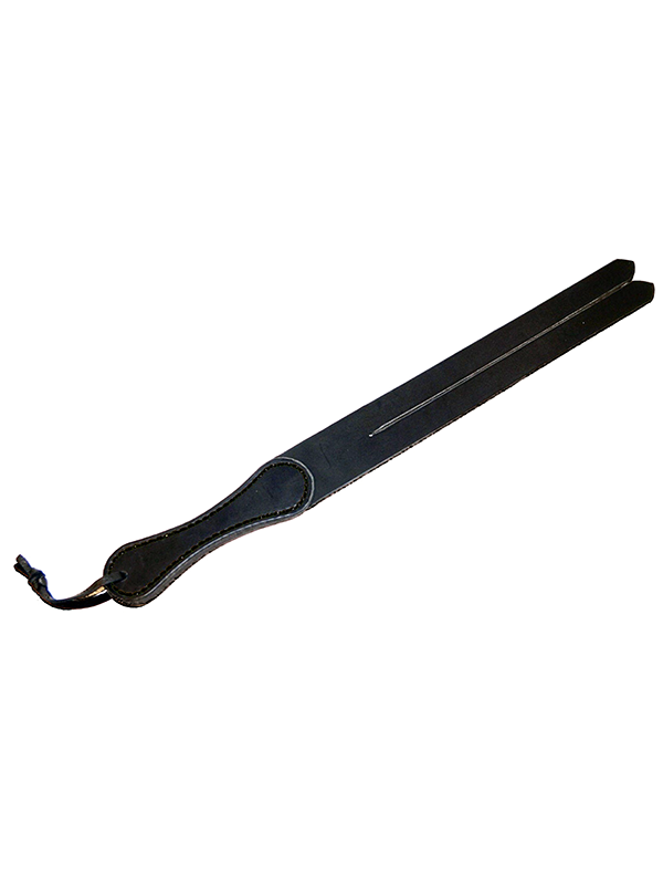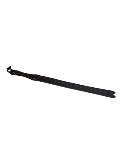 This playful leather tawse from 6Whips is ready to cause trouble! Constructed from one layer of 1/8" flexible medium/heavy weight English bridle leather. A total of three layers make up the handle, resulting in a durable, easy to hold toy with a handle thickness of just under 1/2". Overall length is 18", with a width of 1 3/4".