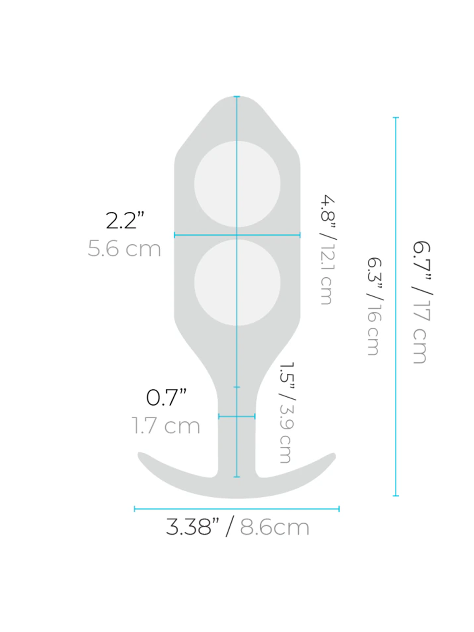 With the same smooth silicone exterior as the rest of the B-Vibe Snug Plugs, this non-vibrating butt plug features an ergonomic base for comfort in all positions and has two steel balls providing a significant weighty feeling. Designed for extended wear as desired.