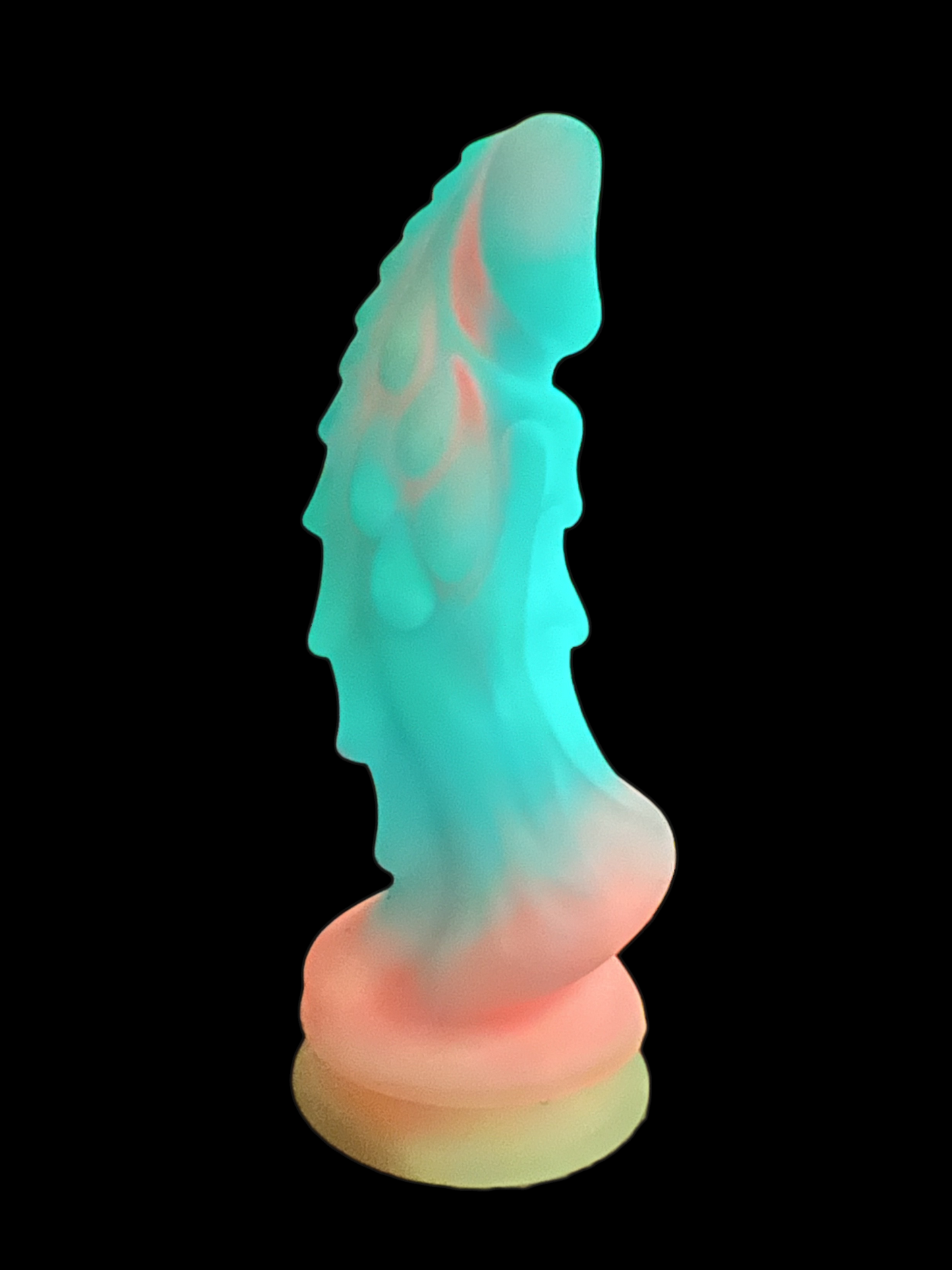 The Creature Dragon Fire Cotton Candy Dildo's fun and whimsy doesn't end with it's brilliant colours and styling, this dildo also glows brightly in the dark! Like all glow-in-the-dark toys, this dildo must be exposed to light first to achieve its brilliant luminescence.
