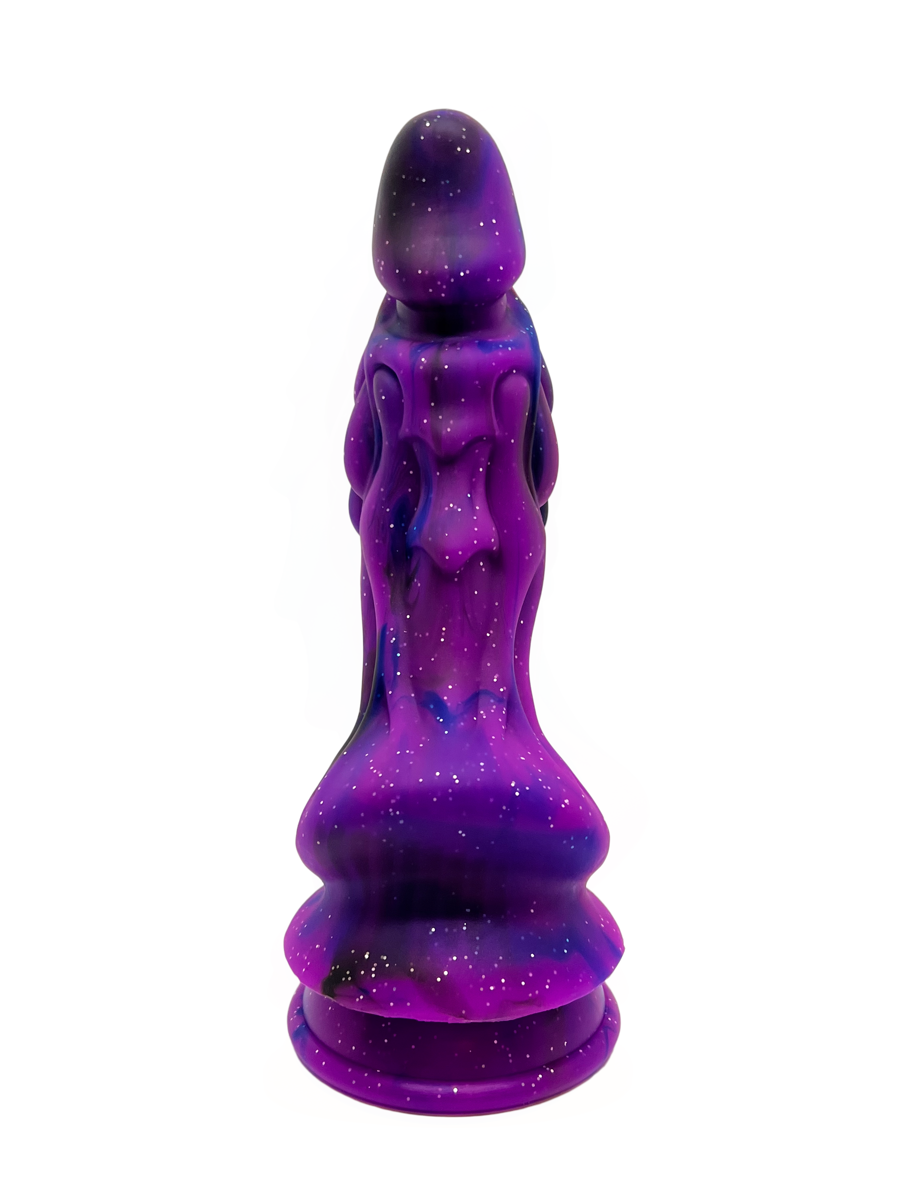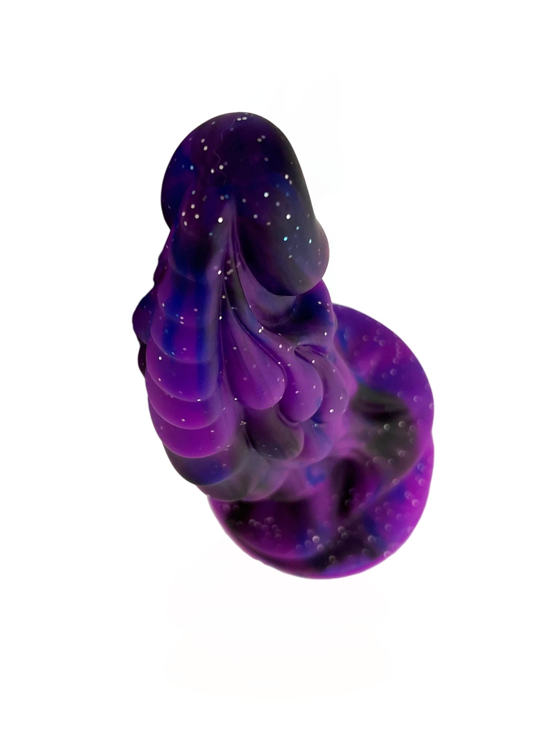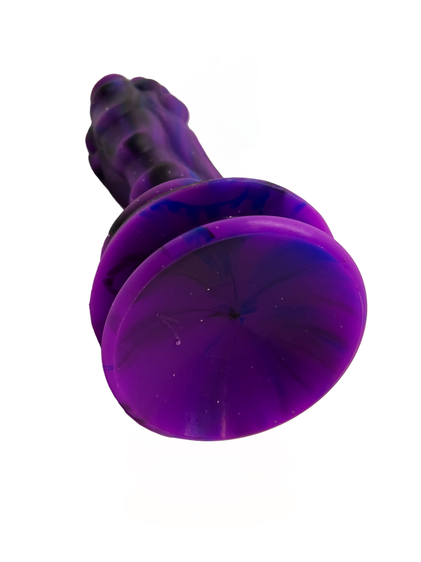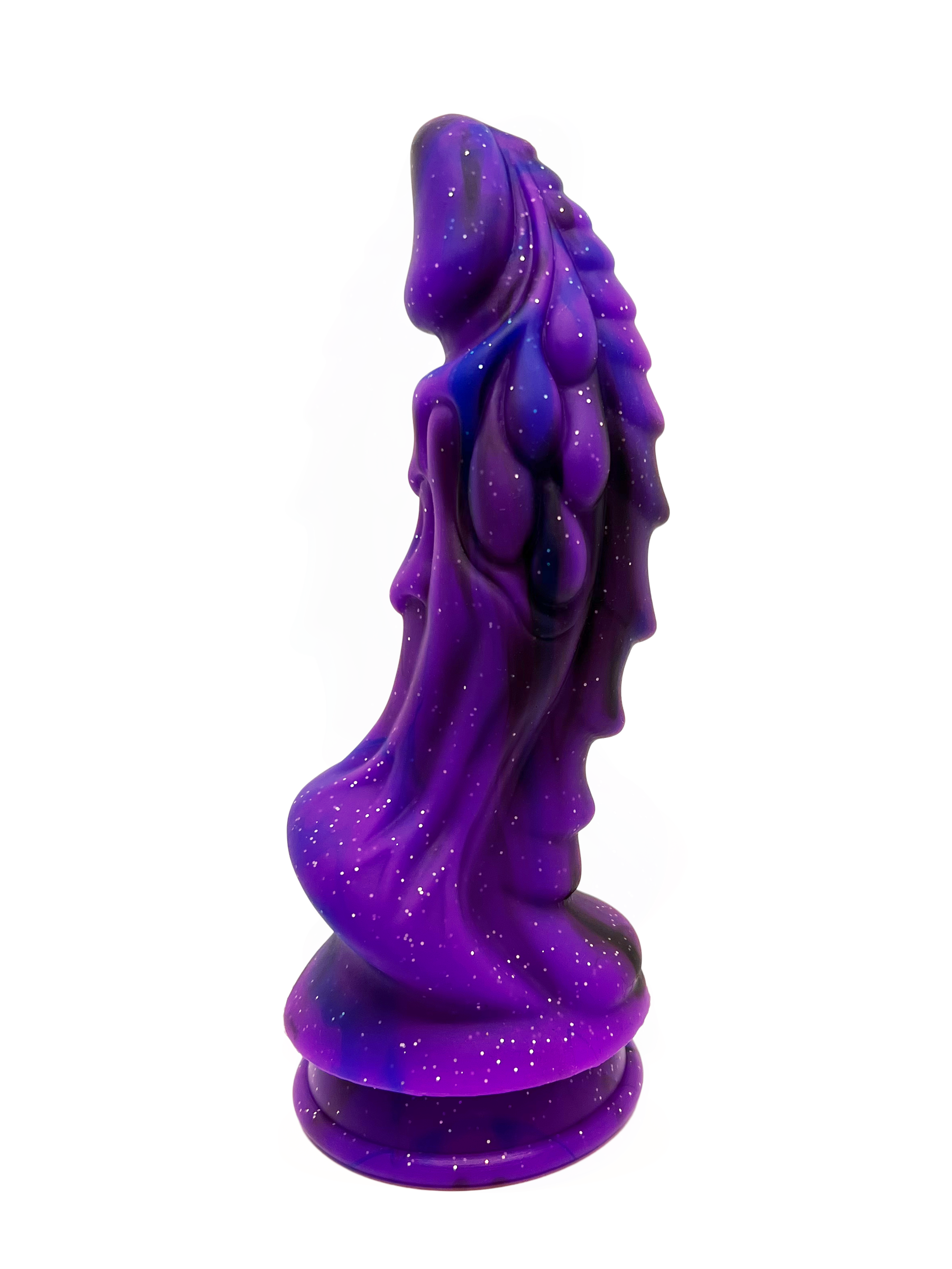 The dominant colour of this dildo is a gorgeous purple with fuchsia undertones and is swirled with black and a little blue silicone throughout the length of the toy. The entire toy has silver sparkles interspersed that pick up the light from almost any angle.