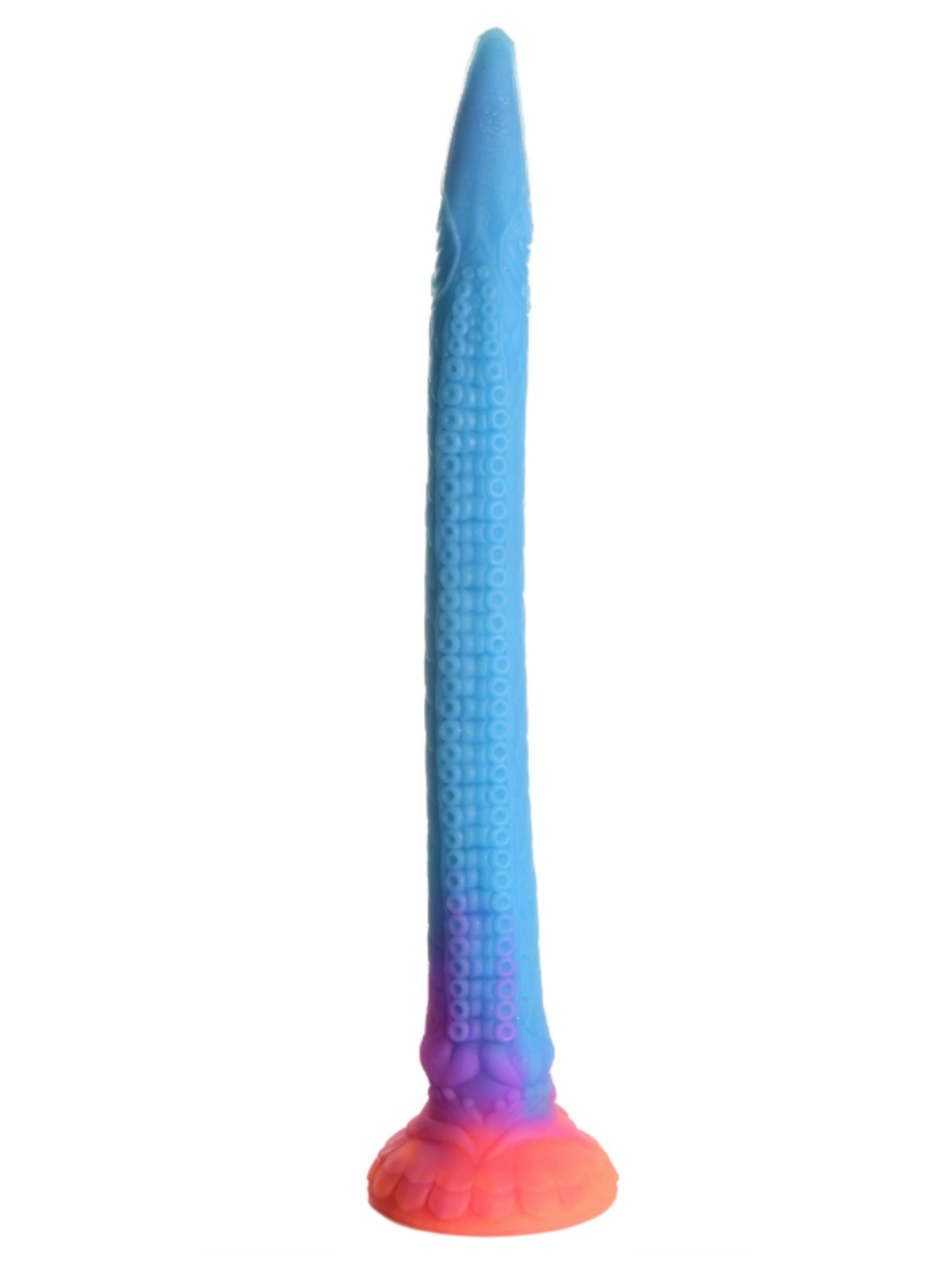 Luxuriate in sixteen inches of this Creature Silicone Dragon Dildo! With a base that is sunburst colours of yellow and orange and a body that is shades of purple and blue, it also has fine, detailed designs along the body and glitter embedded in it, too!