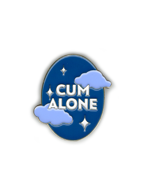 Give yourself the sweetest dreams and wear this soft enamel pin with pride. The words Cum Alone float amidst a soothing backdrop of clouds and stars, evoking the soothing peace that awaits us at the end of a long day. No drama or interpersonal weirdness needed.