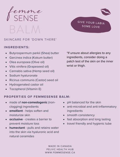 Experience soothing relief from vulvo-vaginal dryness with FemmeSense Balm, made right here in Toronto by the Pelvic Health Hub!