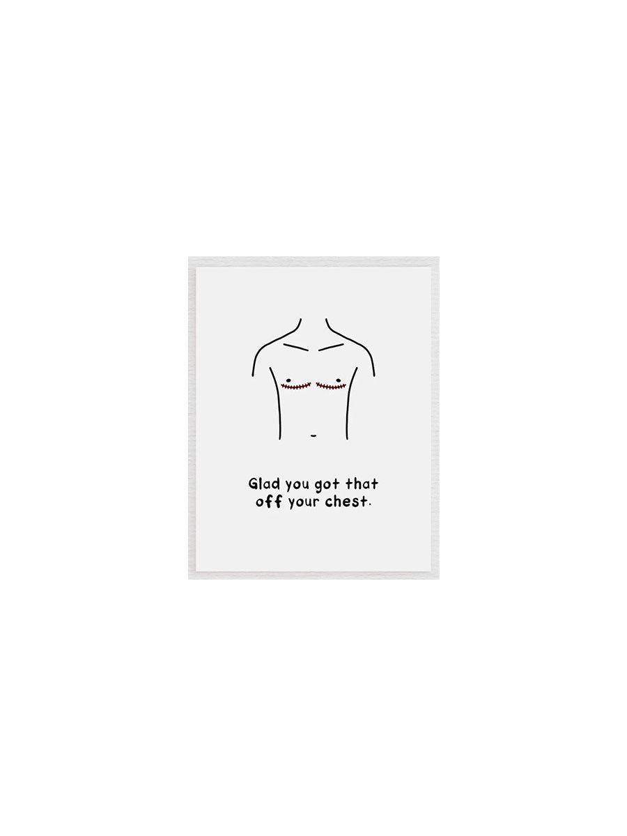 Did a loved one recently have top surgery? Send your well wishes for a speedy recovery with this cheeky "glad you got that off your chest" card.