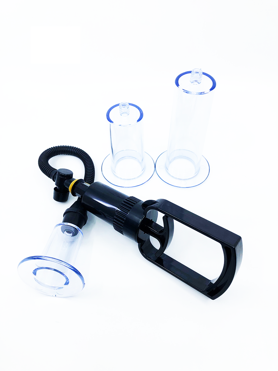 The NYTC Trans Masc Deluxe Pump kit includes 2" x 1" cylinder, 3" x 1.25" cylinder, 4" x 1.25" cylinder, and one pump with a release valve.