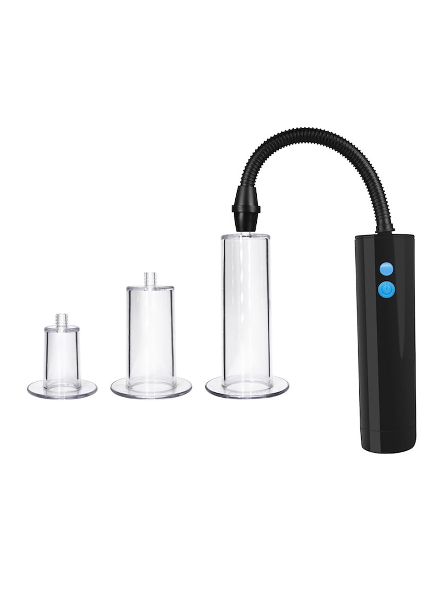 The Trans Masc Deluxe Pump kit includes a 2" x 1" cylinder, 3" x 1.25" cylinder, 4" x 1.25" cylinder, and one rechargeable electric pump with a release valve.