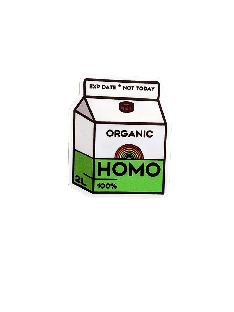 Enjoy this whimsical 100% Organic Homo Milk rainbow sticker and show your pride every day! Made of durable and weatherproof vinyl, the Organic Homo Milk Sticker an original Yas Petit Poulet cute digital Illustration. Handmade in Canada. 2" x 2"