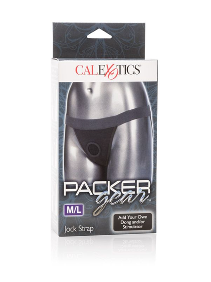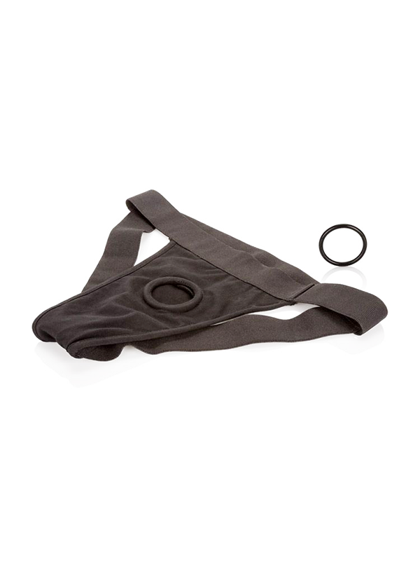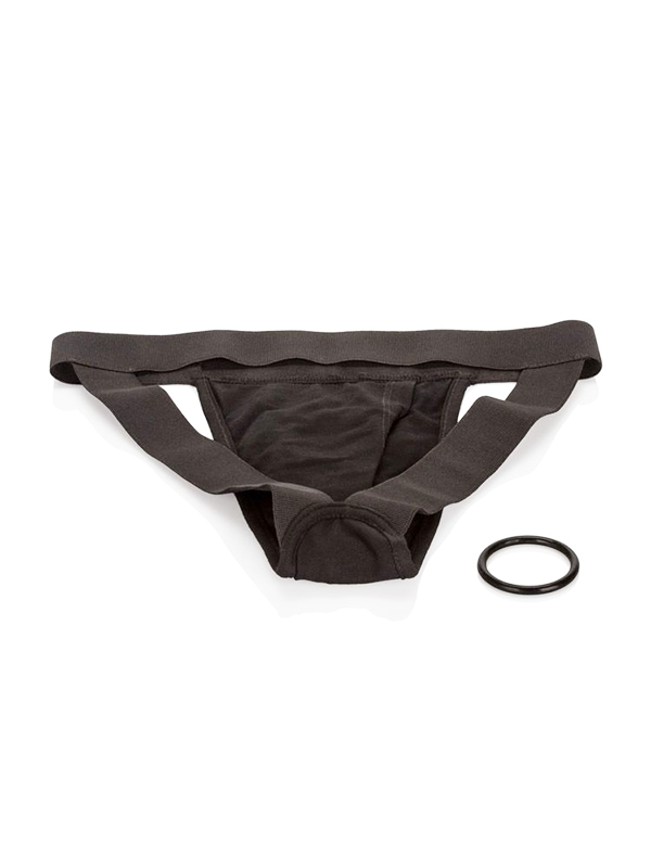 Oof, we're in love with this packing strap! Or, should we say harness? This bad boy does it all! This product features a simple & stretchy jock-strap design, with two installed pouches that can accommodate a vibrating bullet. It's snug, minimalist, and machine washable - all of our favourite things! The O-ring can hold dildos up to 1.5" inches wide. Further, this harness is compatible with double dildos like the Fuze Tango Real. 95% cotton, 5% spandex.