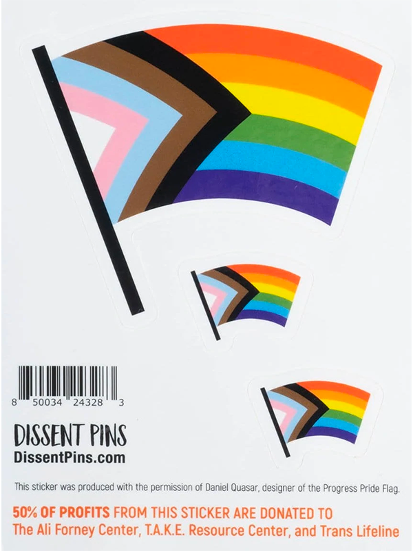 Dissent Pins donates 50% of their profits from this sticker to: T.A.K.E. Resource Center (Birmingham), The Ali Forney Center (NYC), and The Trans Lifeline.Specifications for Progress Pride Flag Sticker Sheet