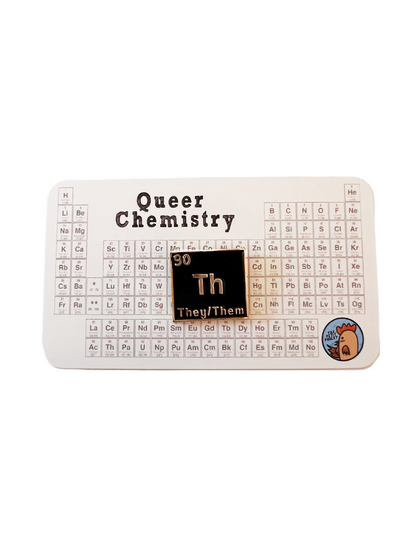 The Queer Chemistry They/Them Pronoun Pin is inspired by Thorium chemical element, with the symbol Th and atomic number 90.