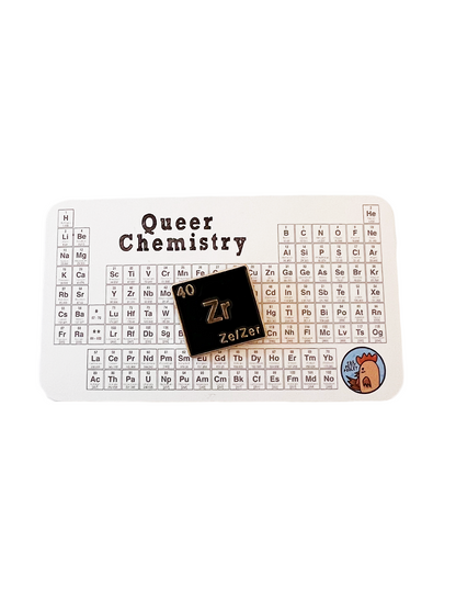 Make your pronouns known without even saying a word with Yas Petit Poulet's sharp Queer Chemistry Ze/Zer Pronoun Pin.