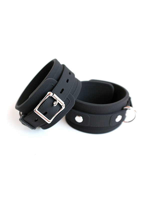 Introducing the Stockroom Silicone Line of supple, sexy, and strong silicone bondage gear! These rugged yet soft locking vegan-friendly cuffs feature an O-ring for hand cuffs or locks and an adjustable closure. Silicone is an ideal material for restraints, since folks don't tend to react to silicone (although there is nickel plated hardware that will touch the wearer's skin on these cuffs). And, silicone is easy to clean! Wash with soap & water, or boil for a few minutes to sanitize these restraints.