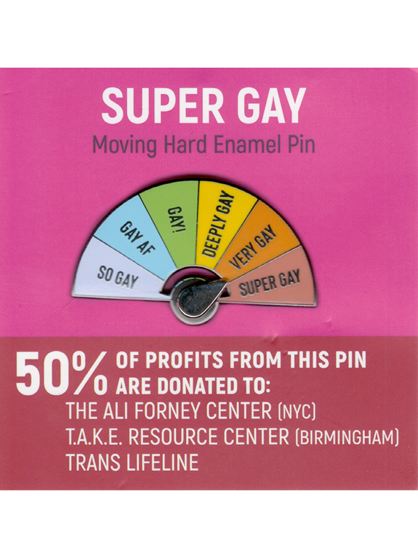 This enamel pin with moving parts is Super Gay! Stick this pin on your jacket or bag and use the moving dial to level up today.