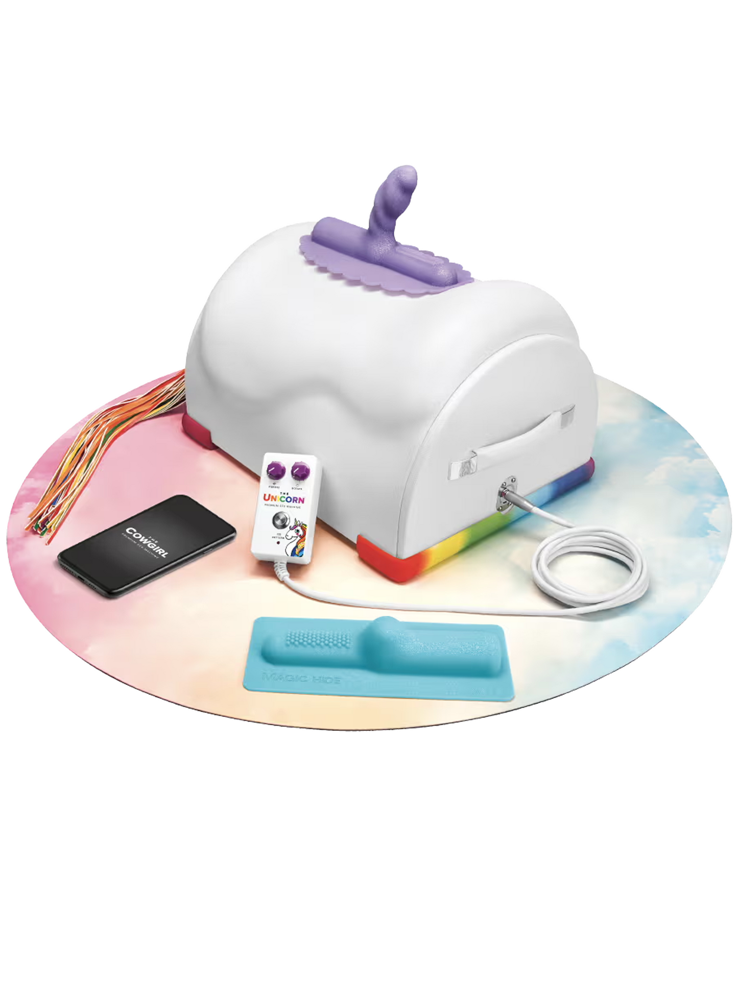 Comes with two attachments (Unihorn + Magic Hide). Check out the whole line of Cowgirl Sex Machine Attachments.