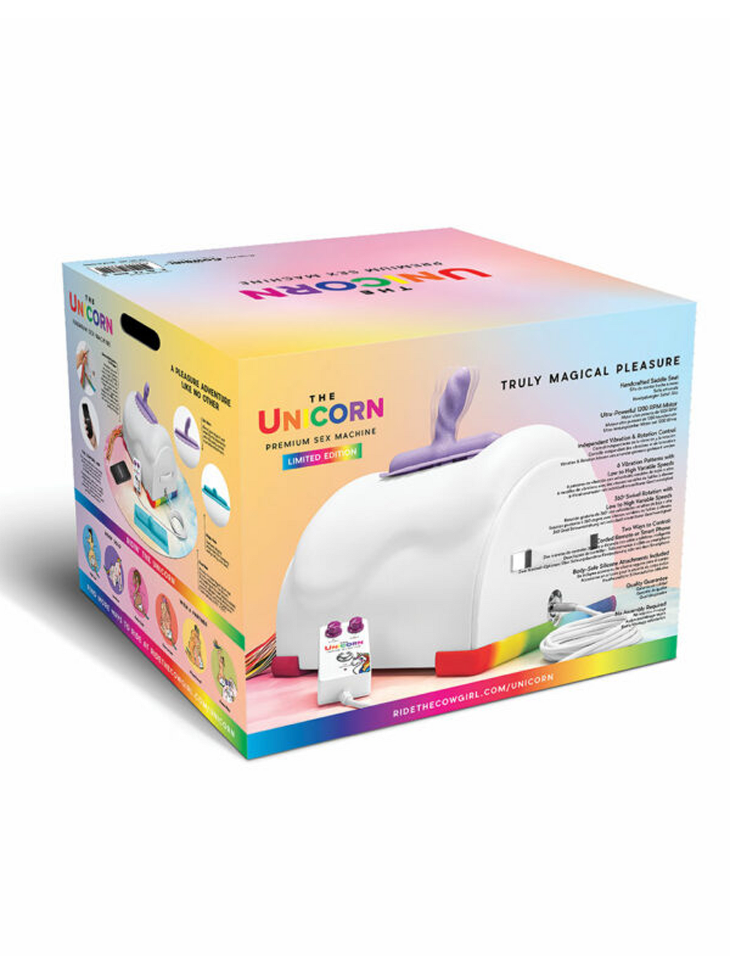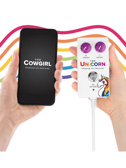 The Cowgirl Unicorn Premium Sex Machine comes complete with remote control, a generous eight foot cord, and tons of attachments! Download the app for wireless remote control from up to 30 feet away!