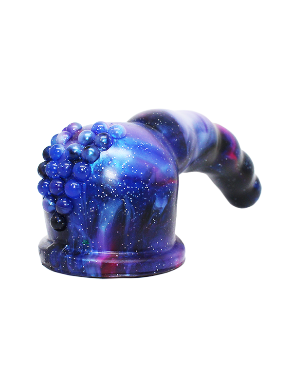 Thanks, Vixen Creations, for another winner! I hesitated to buy this for the longest time due to the price as compared to the Vibratex vinyl attachments, but it was definitely worth it. The fit is perfect and it stays on the wand despite vigorous use. While it dampens the vibration slightly, to me that's a good thing - I love the intense rumble of the magic wand, but it can be a little intense for direct stimulation. Great as a g spot insertable, with or without being attached to the wand. Typical Vixen quality sturdy silicone, firm with a nice smooth finish for minimal friction. There's lots of thoughtfully designed shaping, including a subtle but well placed little ridge at the lip that can give direct clitoral stimulation when the toy is fully inserted (I couldn't see this at all in the stock photos but trust me, it's there). There's lots of texture on the nubbly section for grinding against, and the head of the insertable also works nicely externally for direct clitoral stimulation. All this, and swirly purple galaxy goodness too.